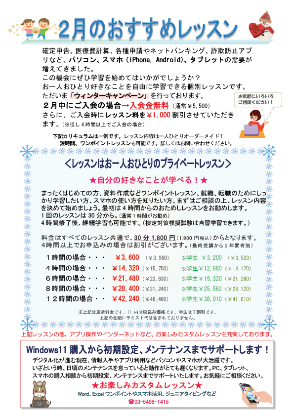 2月は「ウインターキャンペーン」を実施しております。入会金も2月は無料、そしてレッスン料の割引もありますので、ぜひこの機会をお見逃しなく。まずは無料体験レッスンのご予約を!(パソコンスクールアルト 03-5498-1415)